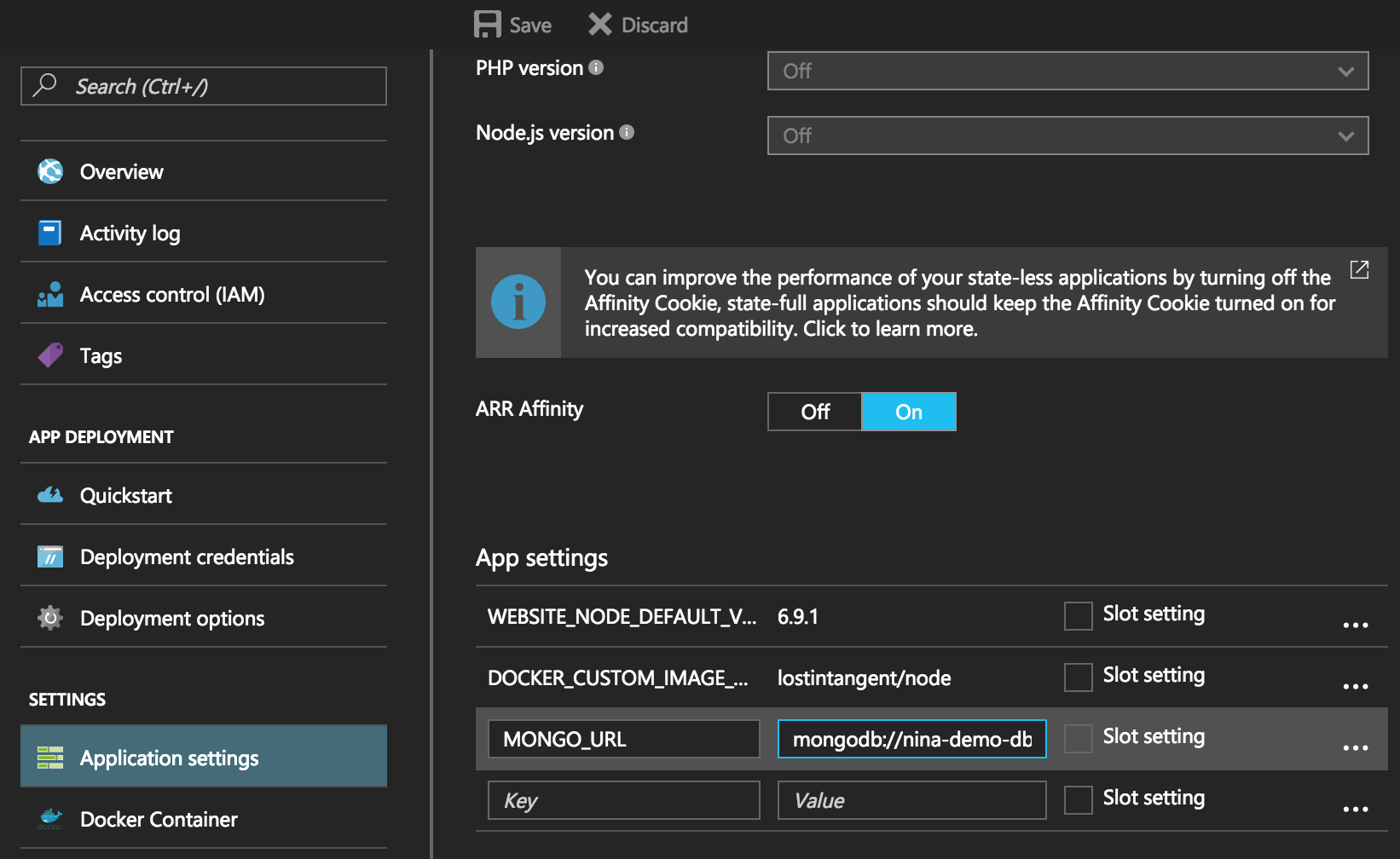 标志设置为您的 DockerHub 帐户/镜像名称az appservice web config container update -n nina-demo-app -g nina-demo -c lostintangent/node