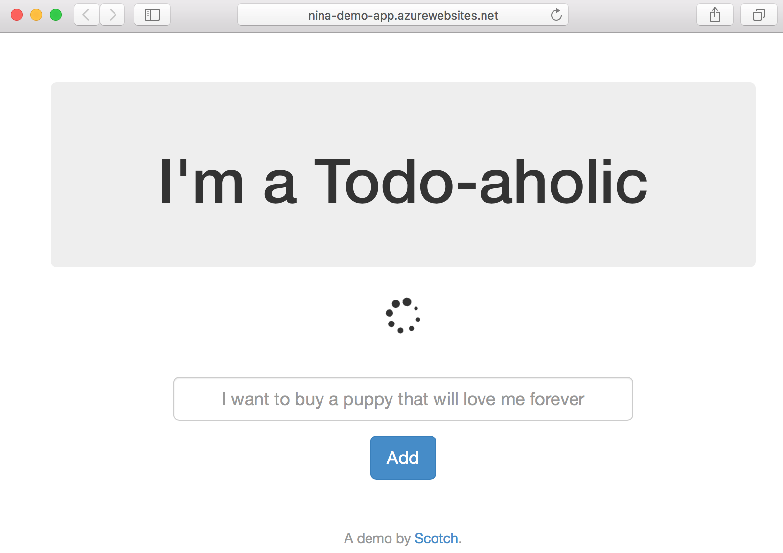 耶!我们刚刚部署了我们的应用程序。然而,旋转图标表明应用程序无法连接到数据库,这很合理,因为我们在开发过程中使用的是本地 MongoDB 实例,这显然无法从 Azure 数据中心访问。幸运的是,由于我们更新了应用程序以通过环境变量接受连接字符串,我们只需启动一个 MongoDB 服务器并重新配置应用服务实例以引用它。