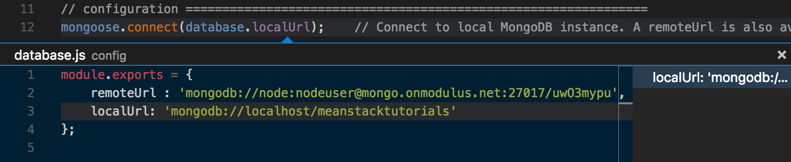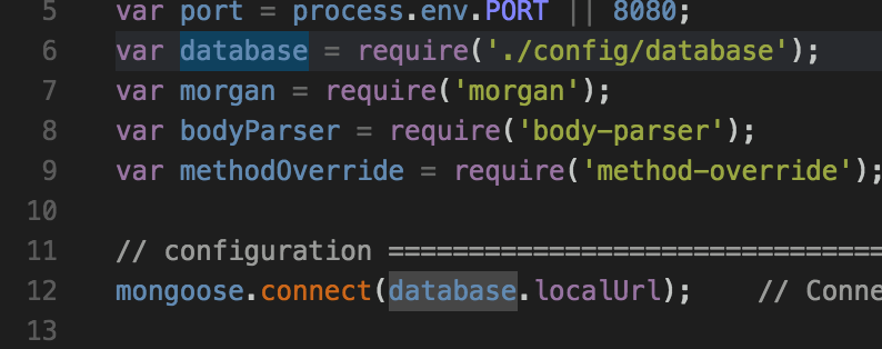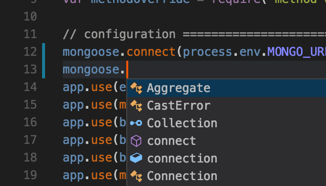 在编写/探索代码时,自动完成可以极大地提高生产力,因为它避免了您需要不断查阅文档或担心 API 拼写错误。例如,让我们通过将第 12 行从这样修改来使用环境变量增强硬编码的 MongoDB 连接字符串: