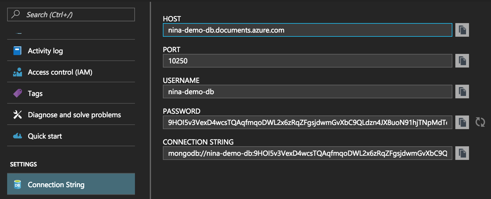 字段旁边的复制按钮,将 MongoDB 连接字符串复制到剪贴板。