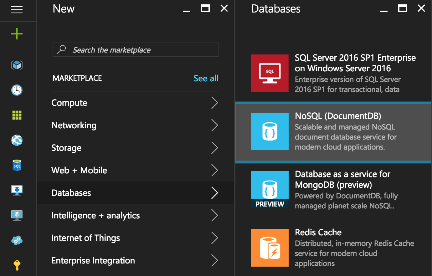 虽然我们可以自己设置 MongoDB 服务器或副本集并管理该基础设施,但 Azure 提供了另一个解决方案,称为 DocumentDB。DocumentDB 是一个完全托管、地理复制、高性能的 NoSQL 数据库,它提供了 MongoDB 兼容层。这意味着您可以将现有的 MEAN 应用程序指向它,而无需更改任何东西,只需更改连接字符串!让我们来看看如何使用它,这次使用 Azure 门户,而不是 CLI。