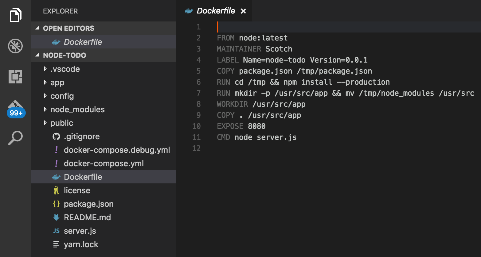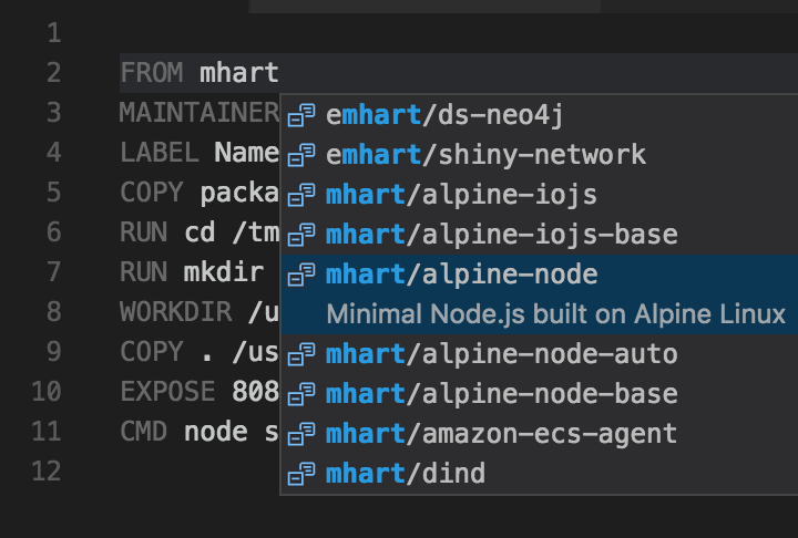 文件提供自动完成功能,这使得编写 Docker 资产变得更加简单。例如,打开 Dockerfile