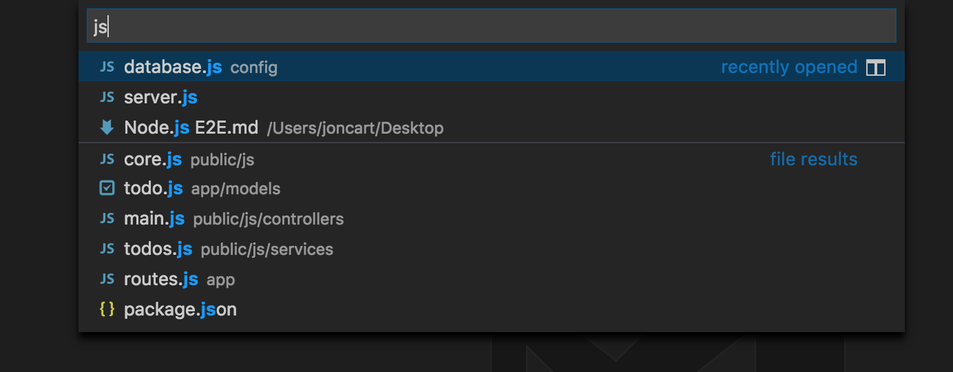 ,这可以查看项目中所有 JavaScript/JSON 文件及其所在的目录。同样,此对话框支持与命令面板相同的“模糊搜索”,因此它非常灵活。 -