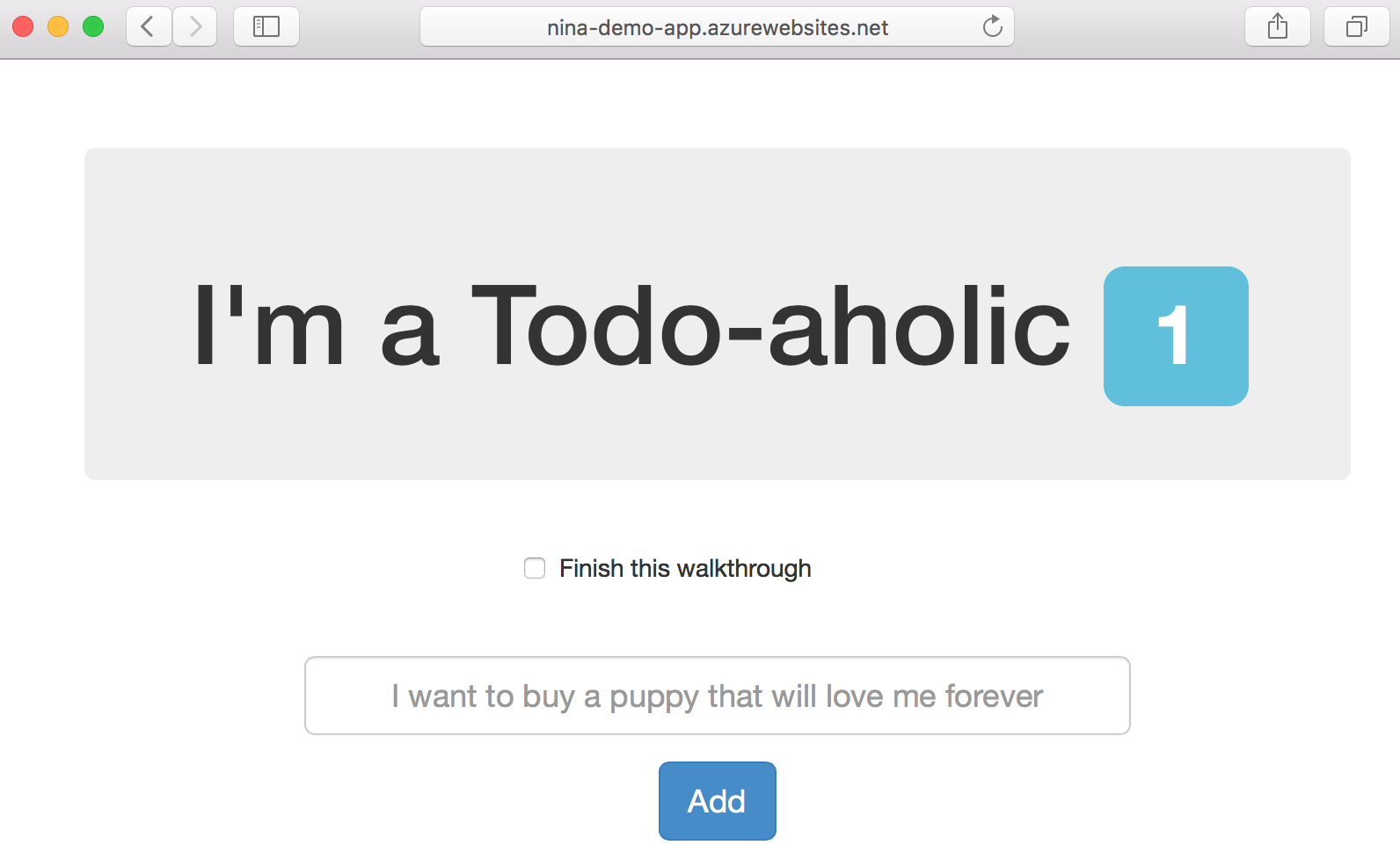 按钮,然后返回浏览器并刷新它。尝试添加和删除一个待办事项,以证明应用程序现在无需更改任何内容即可工作!我们只需将环境变量设置为我们创建的 DocumentDB 实例,该实例完全模拟了一个 MongoDB 数据库。