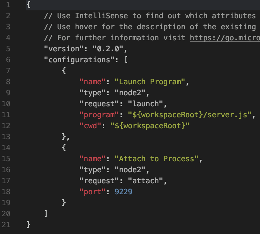 ,它将使用最近添加到 Node.js 的新 Chrome 调试协议支持。这样做会在您的项目中生成一个名为 launch.json